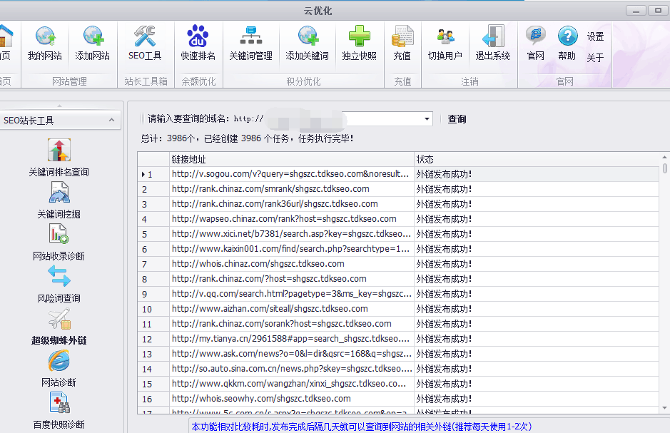 当网站正式上线后,我们对网站进行发布外链,虽然说现在的外链作用没有以前的作用强,但是对于新站来讲,我们还是要对他进行一些外链的发布,我们公司对网站进行在我们开发的优化软件上进行发布,让更多的人知道,了解我们的网站,从而获取更多的流量,提升网站权重及关键词排名。(如下图)
