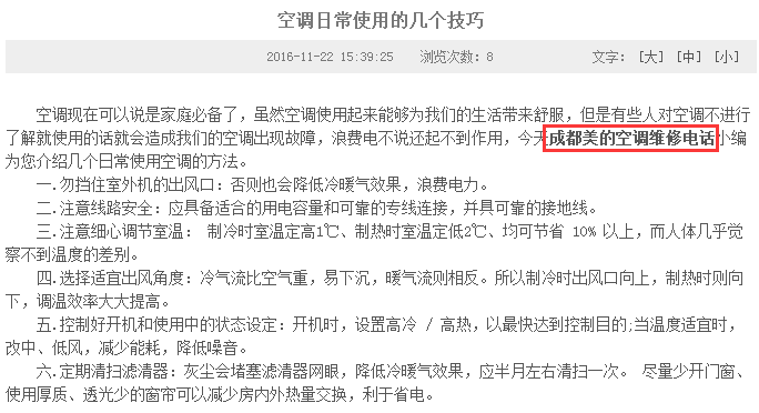 空调现在来讲可以说是各家各户都有的一种家用大型电器,并且美的空调一直占据市场中的大部分地市。既然是一种家用电器,那么我们必然躲不了他的维护保养,如果我们的维护保养工作做不好,那么我们的空调就会出现故障。在此,成都就有一家专业美的空调维修中心,并且在16年11月份委托我们北京网站优化公司将网站www.chengdumidea.com中的关键词“成都美的空调维修电话”优化至百度搜索引擎的首页,现如今,我们已经成功的将网站关键词优化至百度首页,下面我们就来为您介绍关键词快速上首页的方法秘诀: